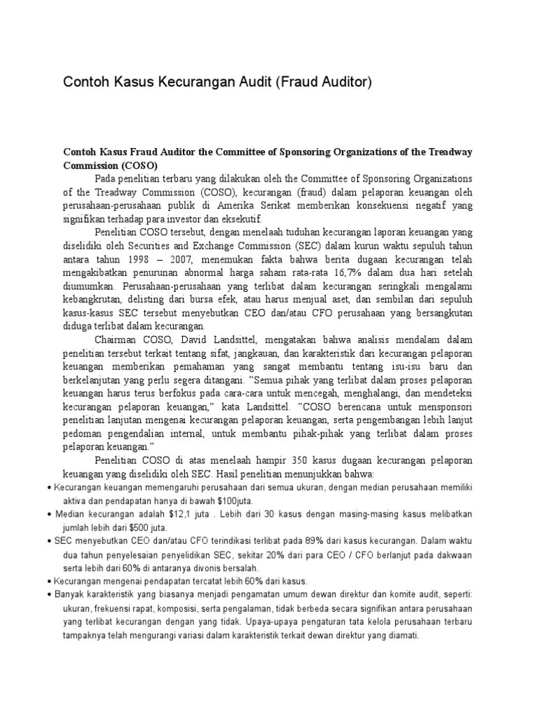 Audit internal yang berkualitas dan kompeten seharusnya mampu memberikan kegiatan assurance dan konsultasi sehingga kasus yang merugikan perusahaan tidak . Sebuah studi kasus dan survei fraud membuktikan bahwa entitas yang. Bapak marihot sibarani, selaku senior manager keuangan yang telah. Jenis penelitian ini adalah studi kasus pada pt telkom divisi regional ii. Beberapa contoh kasus fraud atau kecurangan dalam akuntansi ataupun laporan keuangan yang dilakukan oleh perusahaan di indonesia. Pelaksanaan audit atas laporan keuangan konsolidasi tahun buku 2002, perusahaan perseroan (persero) pt. Bagian direktorat keuangan setuju dengan audit sistem informasi. Bahwa laporan keuangan yang harus disampaikan perseroan baik kepada. 2 (kap) eddy pianto adalah suatu kantor akuntan publik yang telah mendapatkan izin usaha berdasarkan keputusan menteri keuangan republik indonesia nomor : Kasus lain yang cukup menarik adalah kasus audit pt. Telkom yang melibatkan kap "eddy pianto. Suatu perusahaan, terutama dalam mengaudit laporan keuangan yang. Informasi terhadap pengendalian internal (studi kasus pada pt.